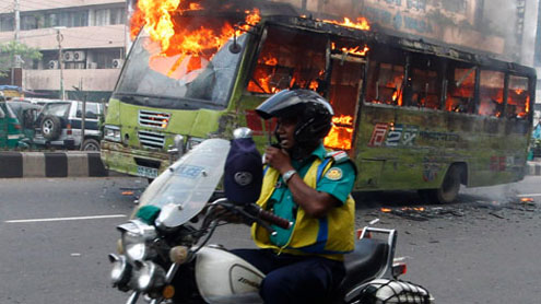 Protesters set ablaze vehicles and clashed with police outside the court. “We have arrested eight people over the torching of four buses and a taxicab,” city police spokesman Masud Ahmed said.Dozens were hurt when police fired rubber bullets at hundreds of demonstrators in the northwestern town of Thakurgaon after they went on a rampage to protest against the court decision, police superintendent Belayet Hossain told AFP.