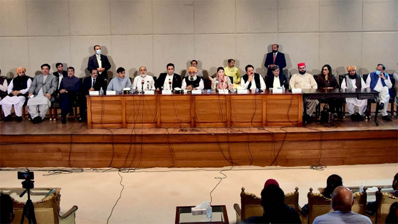 Jamiat Ulema-e-Islam Amir and PDM President, Maulana Fazlur Rehman along with Vice President of Pakistan Muslim League-Nawaz (PML-N) Maryam Nawaz, Chairman Pakistan People’s Party, Bilawal Bhutto Zardari, PML-Q’s Tariq Bashir Cheema, ANP’s Aimal Wali Khan, MQM’s Usama Qadri, leader of Balochistan Awami Party (BAP) Khalid Magsi, leader of Balochistan National Party (BNP) Agha Hassan Baloch and independent MNAs Aslam Bhutani and Mohsin Dawar were addressing a joint press conference centered on the current political situation that took a tailspin after Hamza Shahbaz’s election as Chief Minister of Punjab.